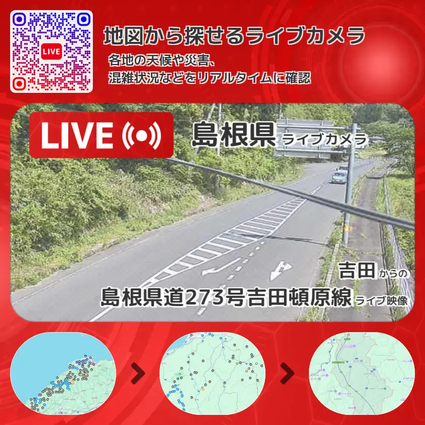 吉田(吉田町市街地付近)から、島根県道273号吉田頓原線が確認できるライブカメラです。