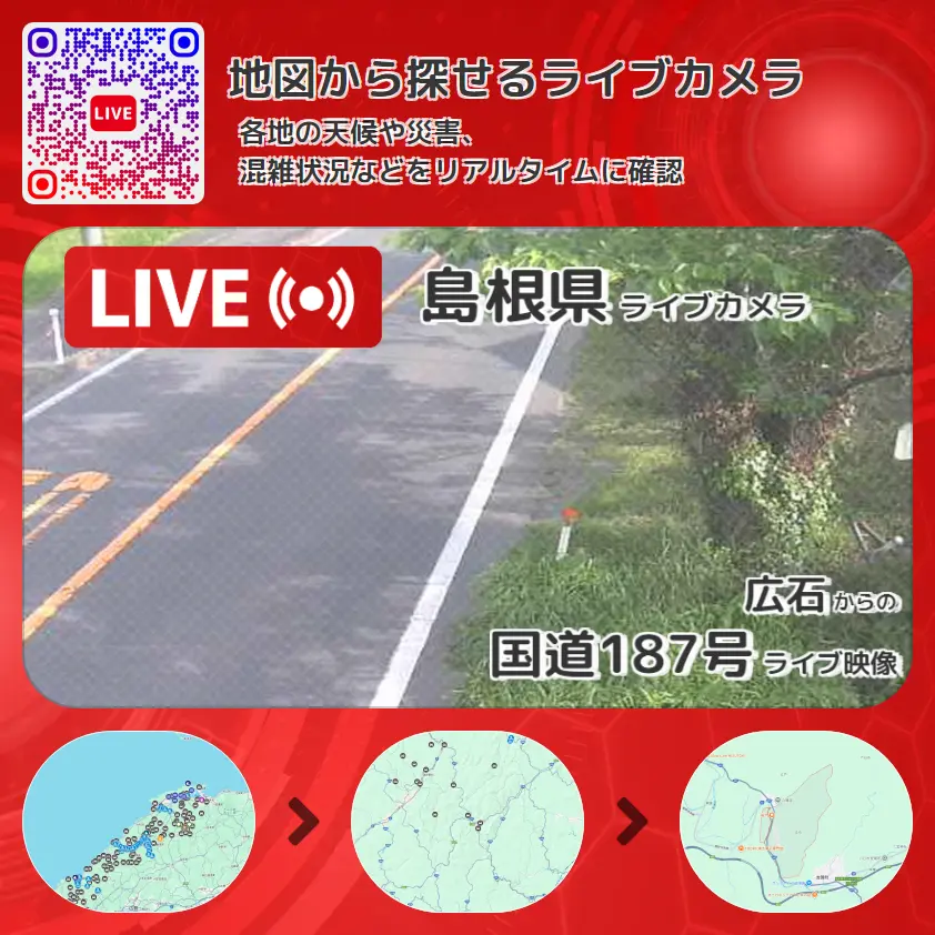 周辺の気象状況も併せてチェックすることが可能で、台風・大雨・地震などの災害による被害状況も把握することができます。
