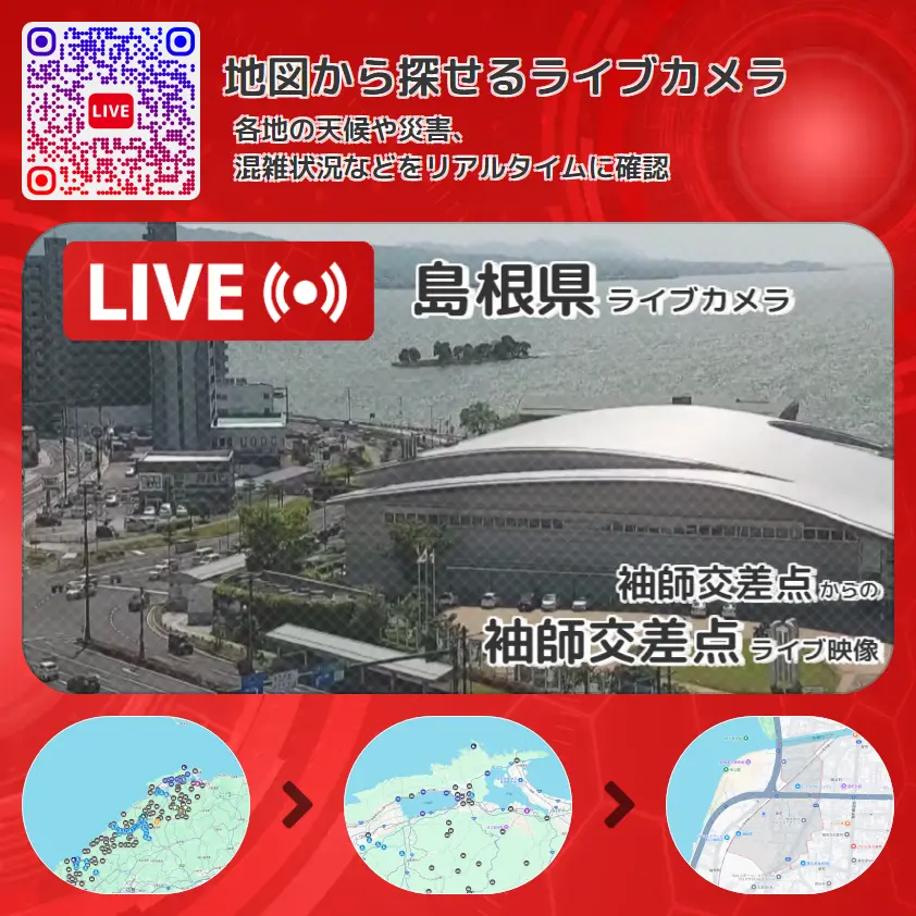 袖師交差点の他に、国道9号(宍道湖通り)や周辺の気象状況も併せてチェックすることが可能で、台風・大雨・地震などの災害による被害状況も把握することができます。