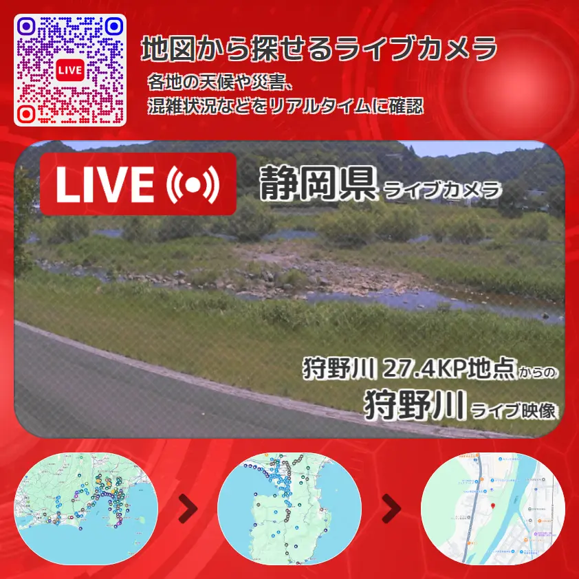 狩野川の他に、狩野川古川合流地点や周辺の気象状況も併せてチェックすることが可能で、台風・大雨・地震などの災害による被害状況も把握することができます。