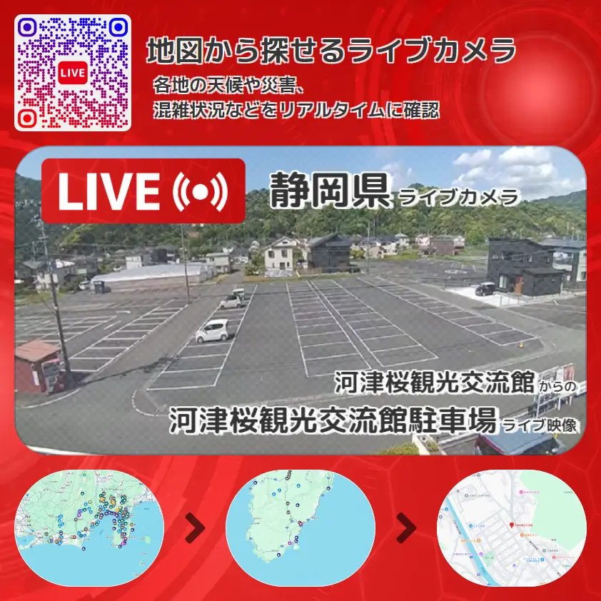 河津桜観光交流館駐車場の他に、観光バス駐車場や周辺の気象状況も併せてチェックすることが可能で、台風・大雨・地震などの災害による被害状況も把握することができます。