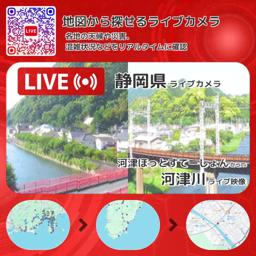 河津川の他に、舘橋や周辺の気象状況も併せてチェックすることが可能で、台風・大雨・地震などの災害による被害状況も把握することができます。