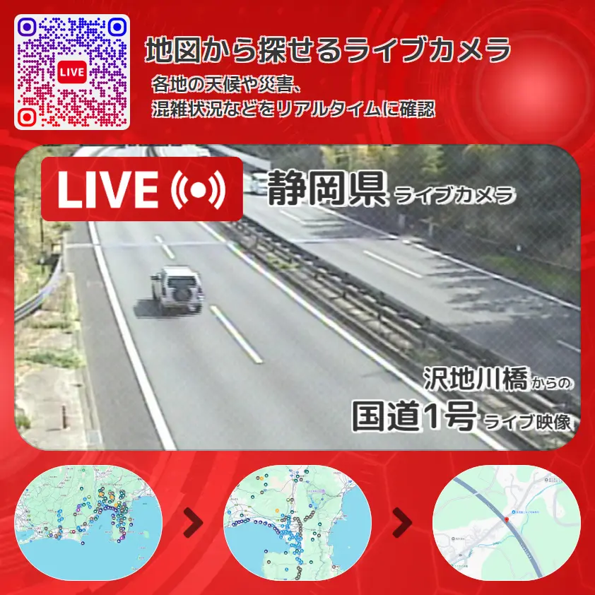 国道1号の他に、伊豆縦貫自動車道(東駿河湾環状道路) 伊豆縦貫道や周辺の気象状況も併せてチェックすることが可能で、台風・大雨・地震などの災害による被害状況も把握することができます。