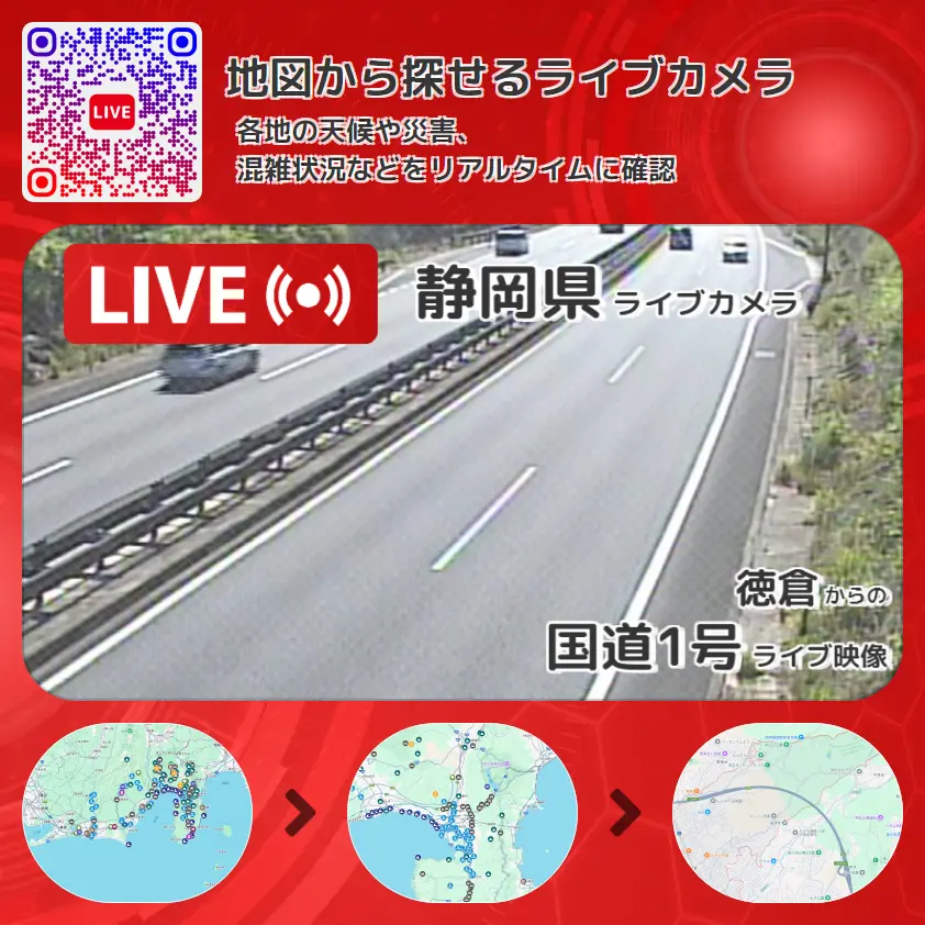 国道1号の他に、伊豆縦貫自動車道(東駿河湾環状道路) 伊豆縦貫道や周辺の気象状況も併せてチェックすることが可能で、台風・大雨・地震などの災害による被害状況も把握することができます。