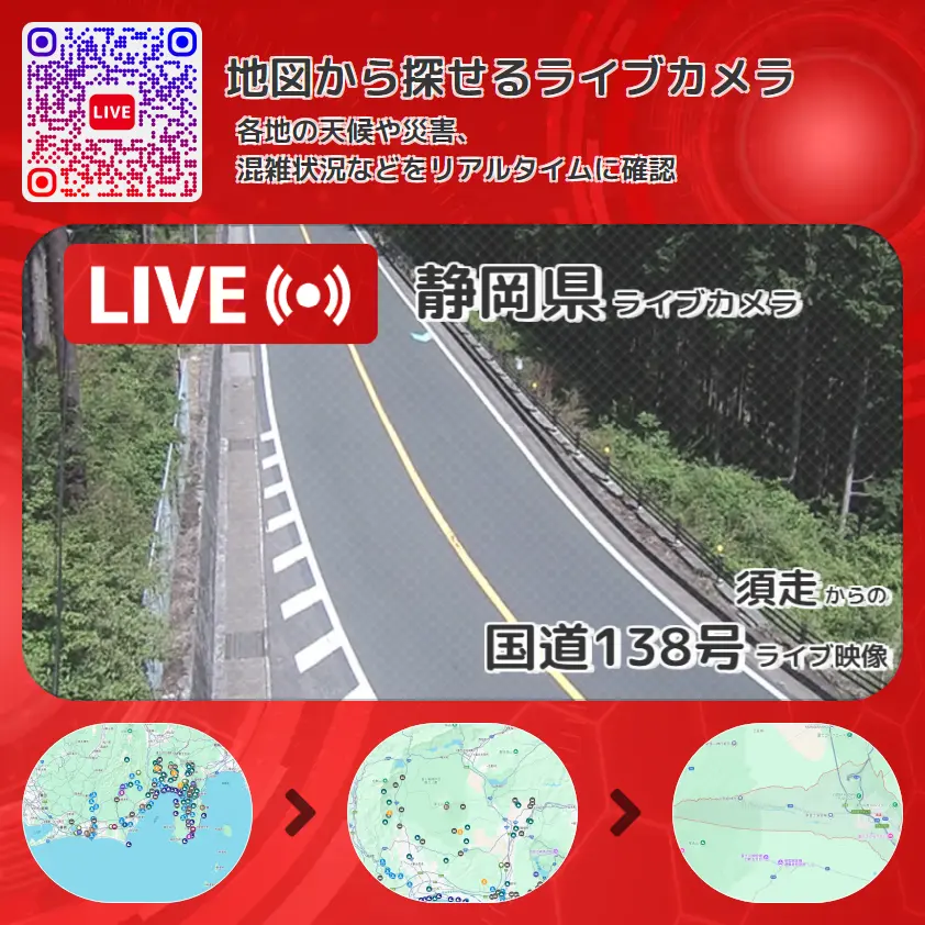周辺の気象状況も併せてチェックすることが可能で、台風・大雨・地震などの災害による被害状況も把握することができます。