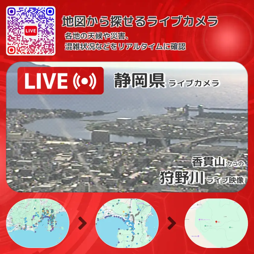 狩野川の他に、狩野川花火大会や周辺の気象状況も併せてチェックすることが可能で、台風・大雨・地震などの災害による被害状況も把握することができます。