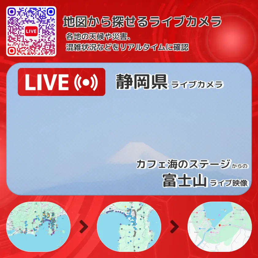 富士山の他に、駿河湾や周辺の気象状況も併せてチェックすることが可能で、台風・大雨・地震などの災害による被害状況も把握することができます。