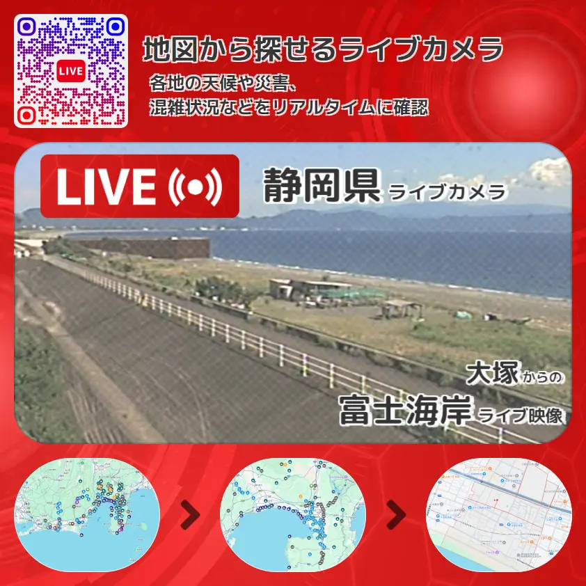 富士海岸の他に、駿河湾や周辺の気象状況も併せてチェックすることが可能で、台風・大雨・地震などの災害による被害状況も把握することができます。