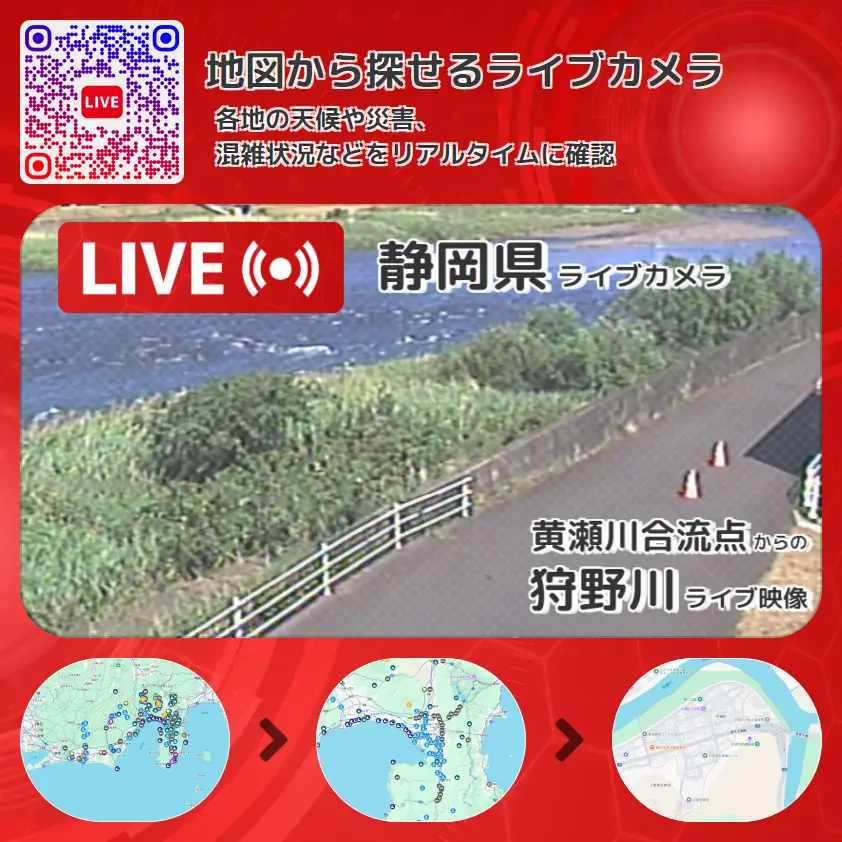 周辺の気象状況も併せてチェックすることが可能で、台風・大雨・地震などの災害による被害状況も把握することができます。