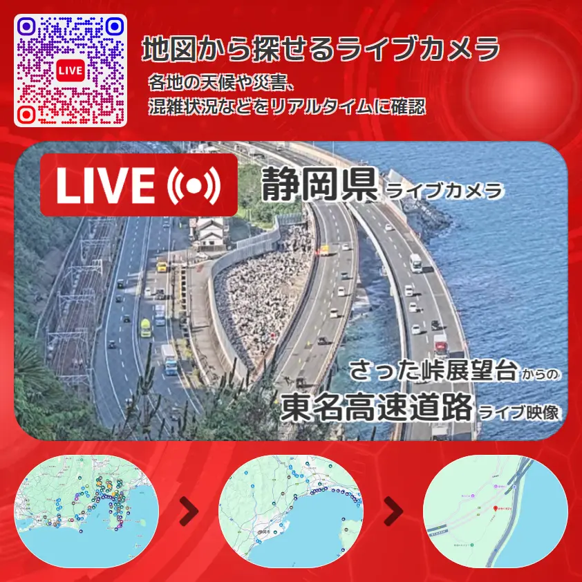 東名高速道路の他に、国道1号(富士由比バイパス)や周辺の気象状況も併せてチェックすることが可能で、台風・大雨・地震などの災害による被害状況も把握することができます。