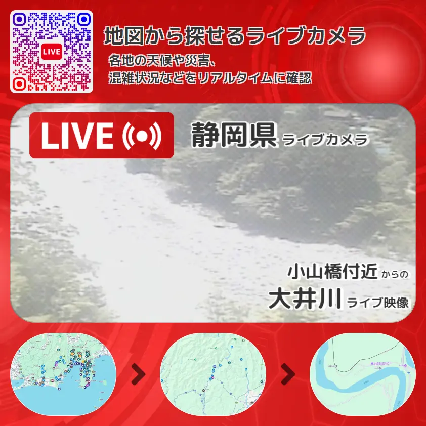 大井川の他に、長島ダム放流状況や周辺の気象状況も併せてチェックすることが可能で、台風・大雨・地震などの災害による被害状況も把握することができます。