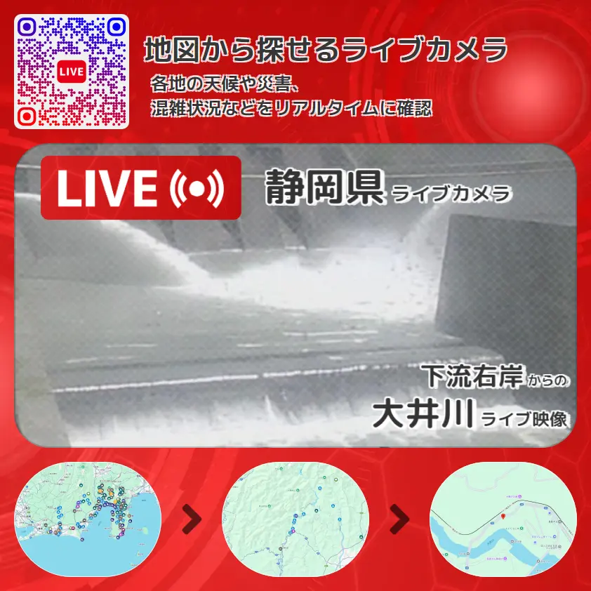大井川の他に、長島ダム放流状況や周辺の気象状況も併せてチェックすることが可能で、台風・大雨・地震などの災害による被害状況も把握することができます。