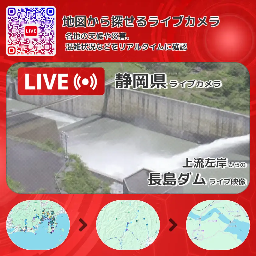 長島ダムの他に、長島ダム放流状況や周辺の気象状況も併せてチェックすることが可能で、台風・大雨・地震などの災害による被害状況も把握することができます。