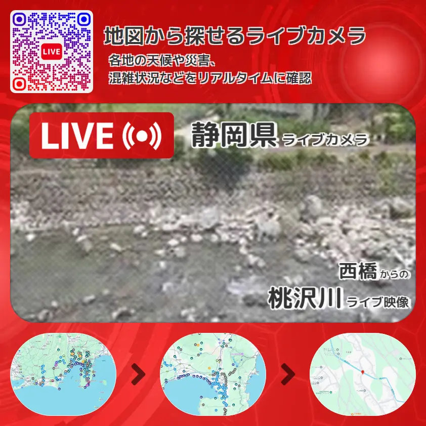 周辺の気象状況も併せてチェックすることが可能で、台風・大雨・地震などの災害による被害状況も把握することができます。