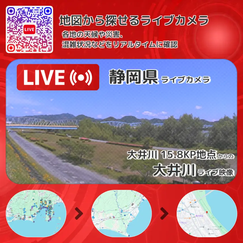 大井川の他に、大井川橋や周辺の気象状況も併せてチェックすることが可能で、台風・大雨・地震などの災害による被害状況も把握することができます。
