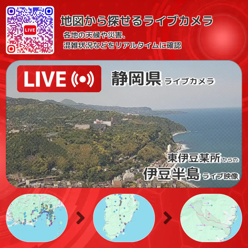 伊豆半島の他に、熱川温泉や周辺の気象状況も併せてチェックすることが可能で、台風・大雨・地震などの災害による被害状況も把握することができます。