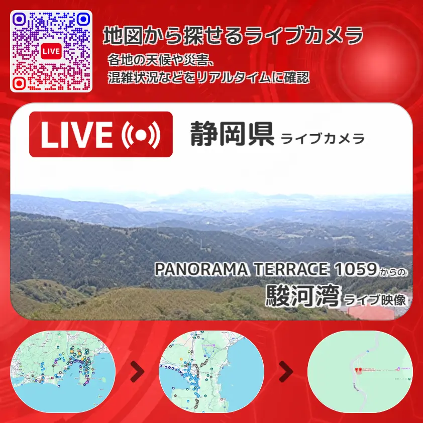 駿河湾の他に、十国峠パノラマケーブルカーや周辺の気象状況も併せてチェックすることが可能で、台風・大雨・地震などの災害による被害状況も把握することができます。