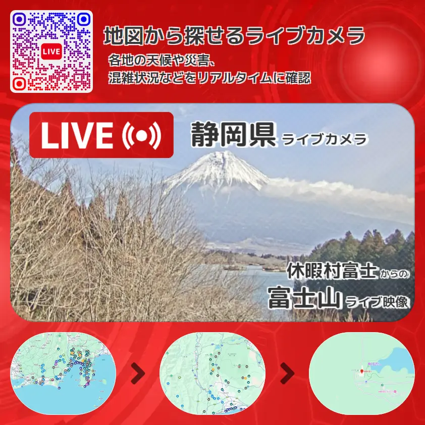 周辺の気象状況も併せてチェックすることが可能で、台風・大雨・地震などの災害による被害状況も把握することができます。