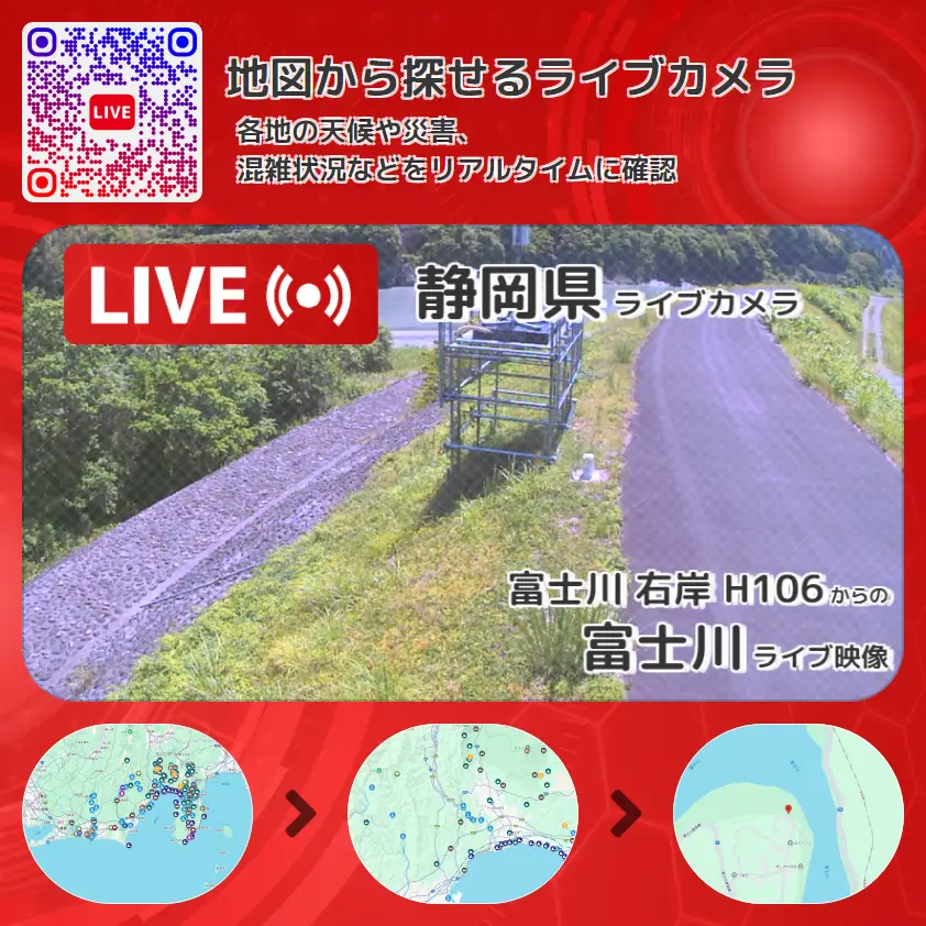 富士川の他に、静岡県道398号上稲子長貫線や周辺の気象状況も併せてチェックすることが可能で、台風・大雨・地震などの災害による被害状況も把握することができます。