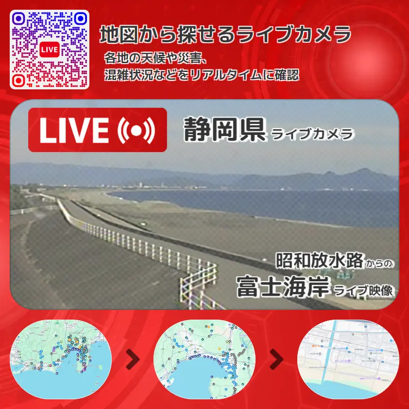 富士海岸の他に、駿河湾や周辺の気象状況も併せてチェックすることが可能で、台風・大雨・地震などの災害による被害状況も把握することができます。