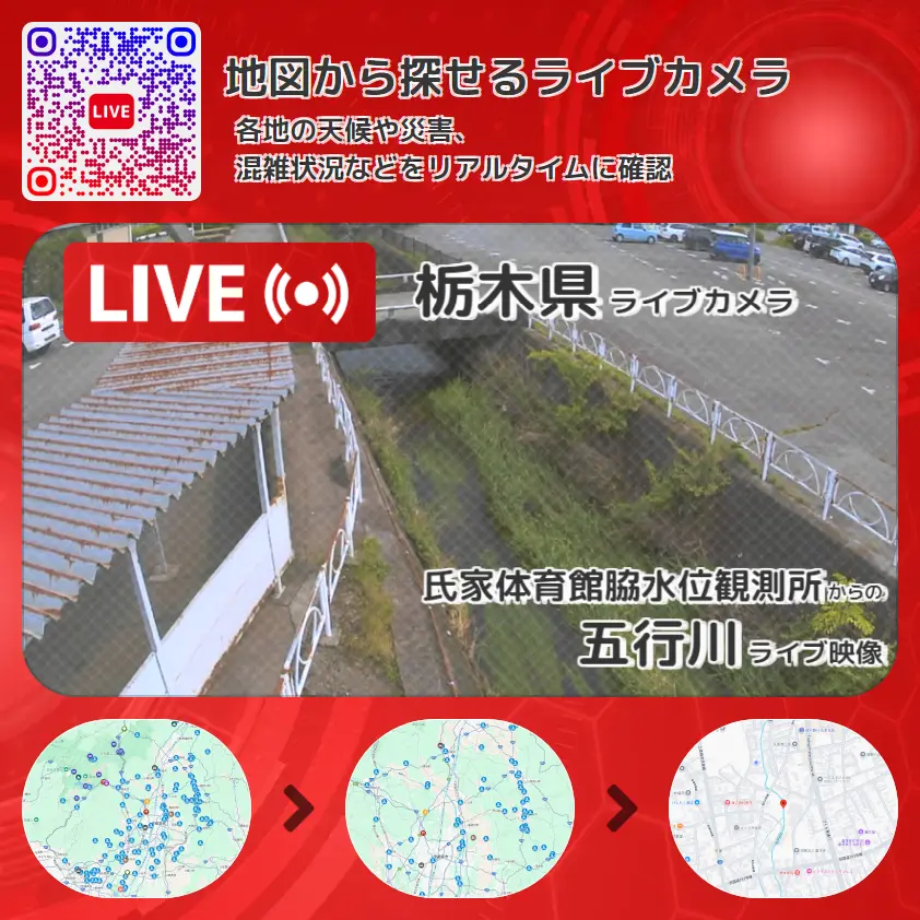 五行川の他に、さくら市氏家体育館や周辺の気象状況も併せてチェックすることが可能で、台風・大雨・地震などの災害による被害状況も把握することができます。