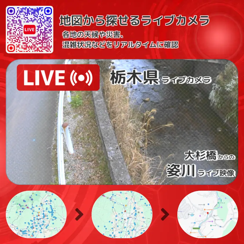 姿川の他に、大杉橋や周辺の気象状況も併せてチェックすることが可能で、台風・大雨・地震などの災害による被害状況も把握することができます。
