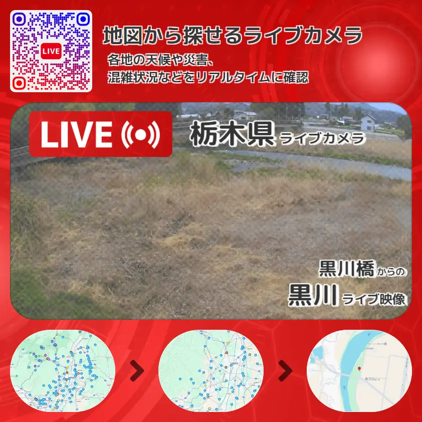 黒川の他に、黒川橋や周辺の気象状況も併せてチェックすることが可能で、台風・大雨・地震などの災害による被害状況も把握することができます。
