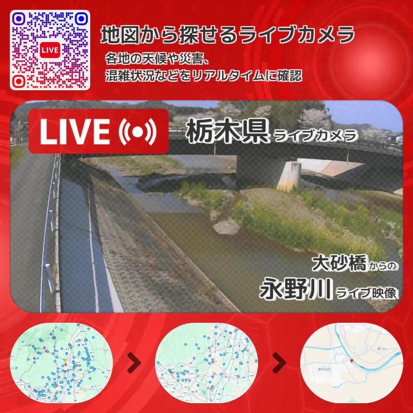 永野川の他に、大砂橋や周辺の気象状況も併せてチェックすることが可能で、台風・大雨・地震などの災害による被害状況も把握することができます。