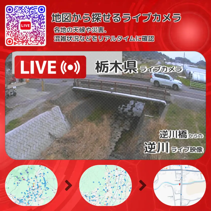 逆川の他に、逆川橋や周辺の気象状況も併せてチェックすることが可能で、台風・大雨・地震などの災害による被害状況も把握することができます。
