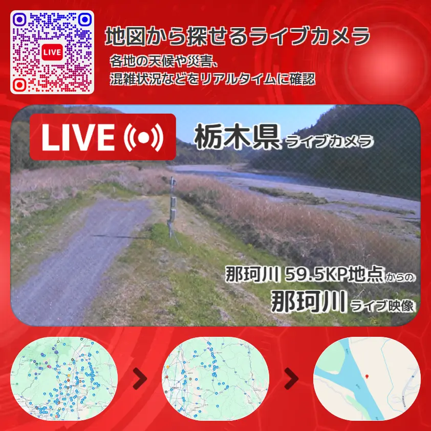 那珂川の他に、那珂川荒川合流地点付近や周辺の気象状況も併せてチェックすることが可能で、台風・大雨・地震などの災害による被害状況も把握することができます。
