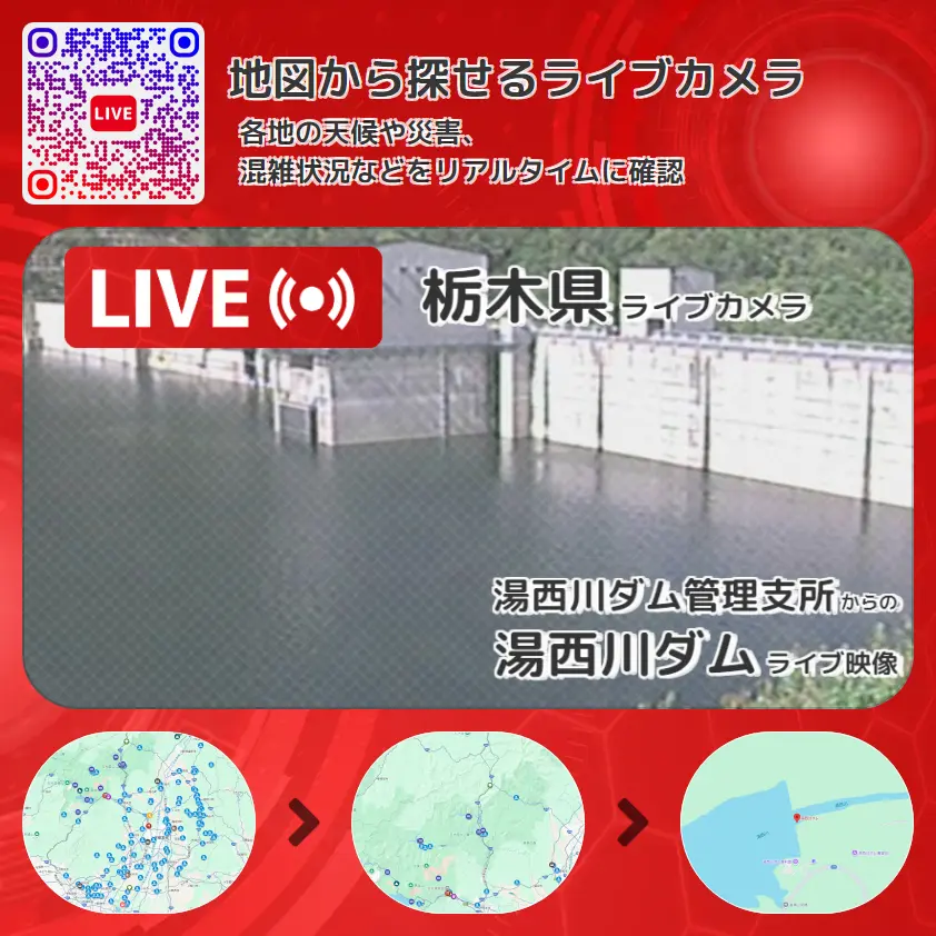 湯西川ダムの他に、湯西川湖や周辺の気象状況も併せてチェックすることが可能で、台風・大雨・地震などの災害による被害状況も把握することができます。
