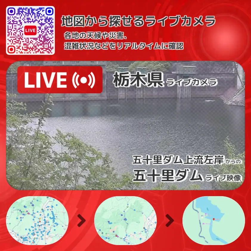 五十里ダムの他に、五十里湖(ダム人造湖)や周辺の気象状況も併せてチェックすることが可能で、台風・大雨・地震などの災害による被害状況も把握することができます。
