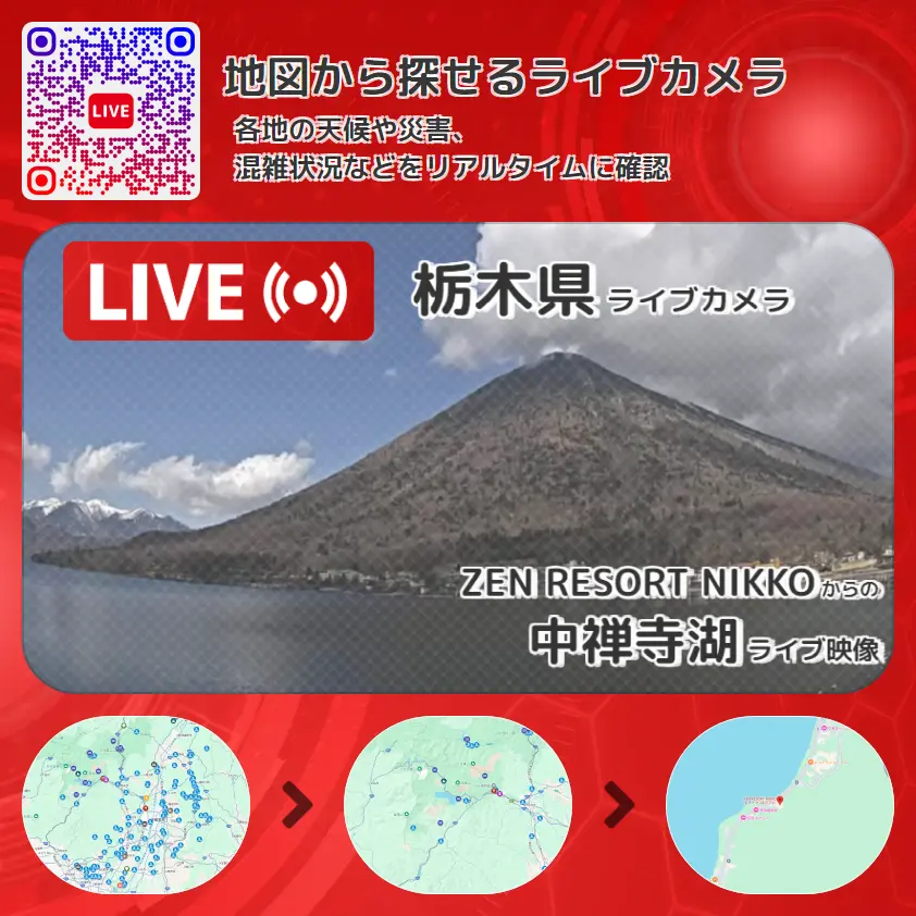 中禅寺湖の他に、栃木県道250号中宮祠足尾線や周辺の気象状況も併せてチェックすることが可能で、台風・大雨・地震などの災害による被害状況も把握することができます。