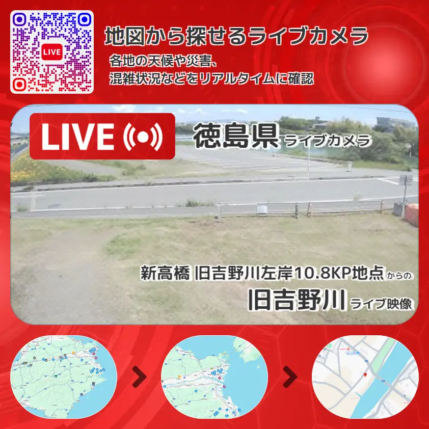 旧吉野川の他に、新高橋や周辺の気象状況も併せてチェックすることが可能で、台風・大雨・地震などの災害による被害状況も把握することができます。
