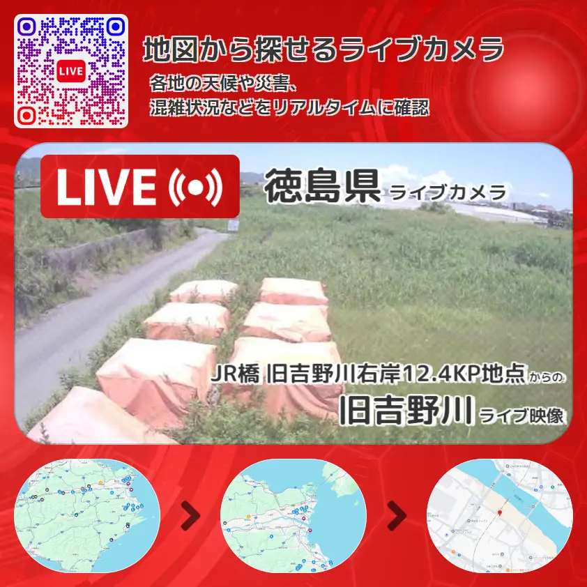 旧吉野川の他に、JR鳴門線(勝瑞駅~池谷駅)や周辺の気象状況も併せてチェックすることが可能で、台風・大雨・地震などの災害による被害状況も把握することができます。