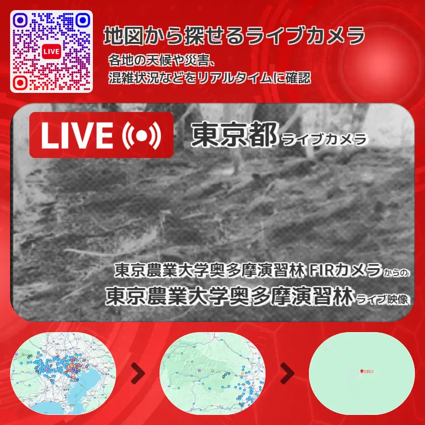 東京農業大学奥多摩演習林の他に、夜間動物観察や周辺の気象状況も併せてチェックすることが可能で、台風・大雨・地震などの災害による被害状況も把握することができます。