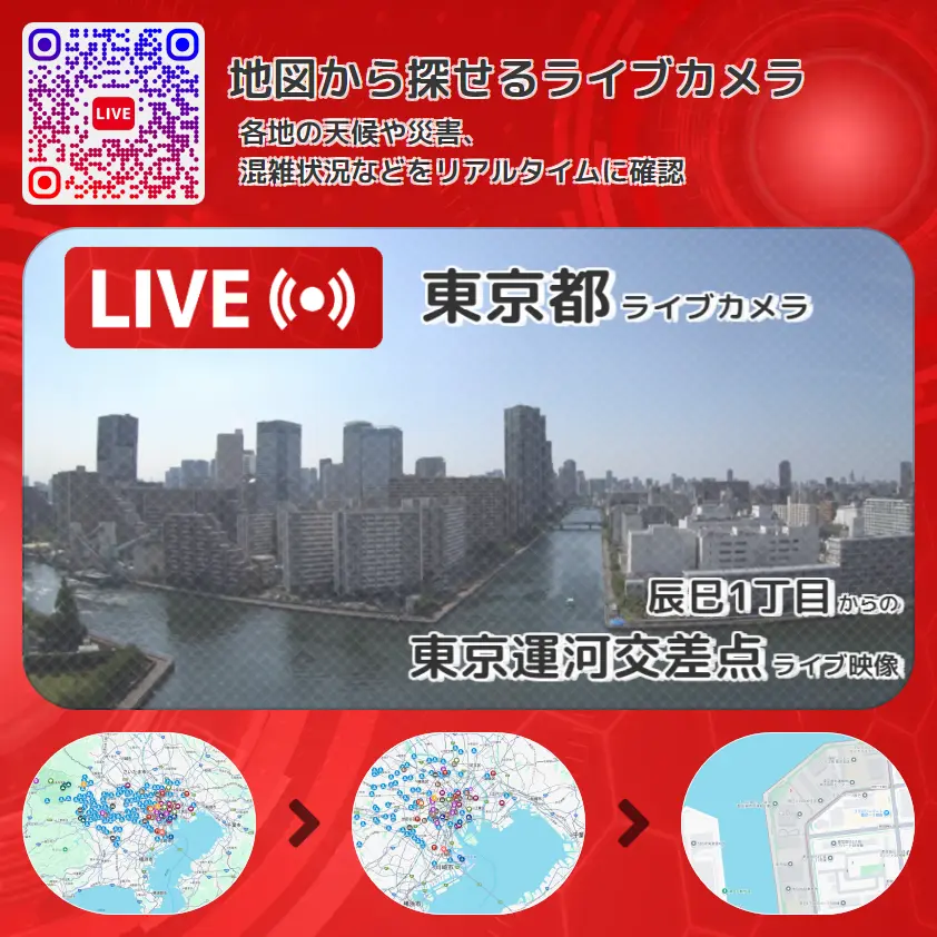 東京運河交差点(豊洲運河・東雲運河)の他に、各種船舶(ジェットスキー・モーターボート・屋形船・釣り船・タグボート・貨物船)や周辺の気象状況も併せてチェックすることが可能で、台風・大雨・地震などの災害による被害状況も把握することができます。