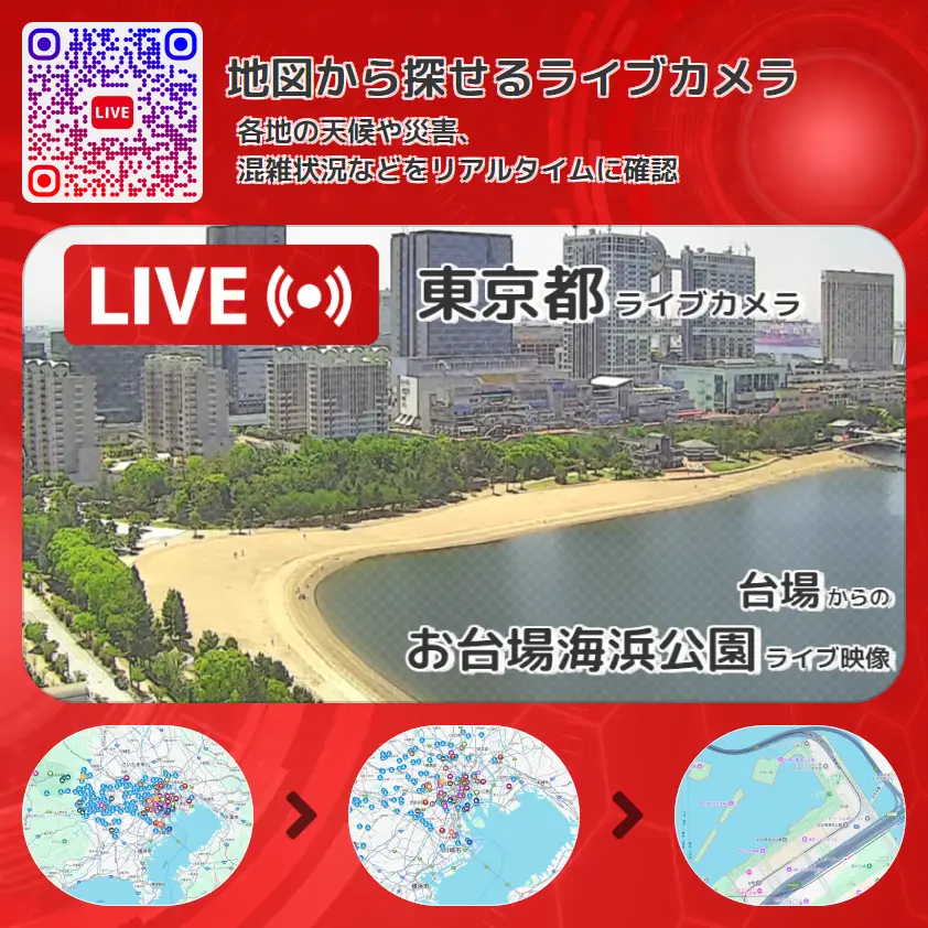 お台場海浜公園の他に、フジテレビ展望台や周辺の気象状況も併せてチェックすることが可能で、台風・大雨・地震などの災害による被害状況も把握することができます。