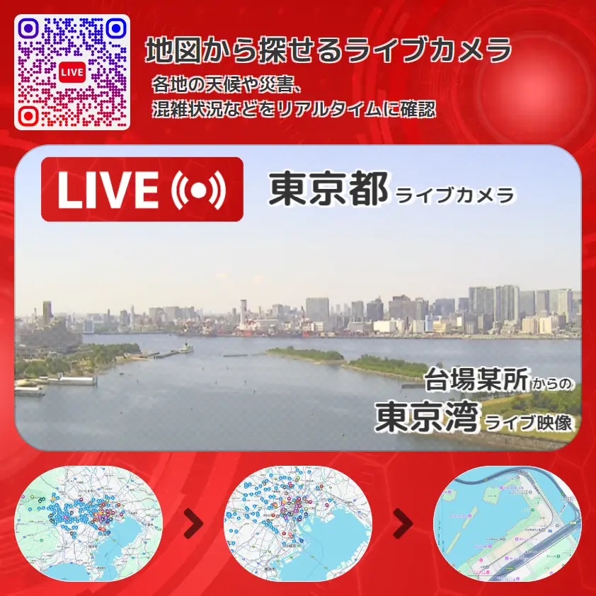 東京湾の他に、羽田空港発着飛行機や周辺の気象状況も併せてチェックすることが可能で、台風・大雨・地震などの災害による被害状況も把握することができます。