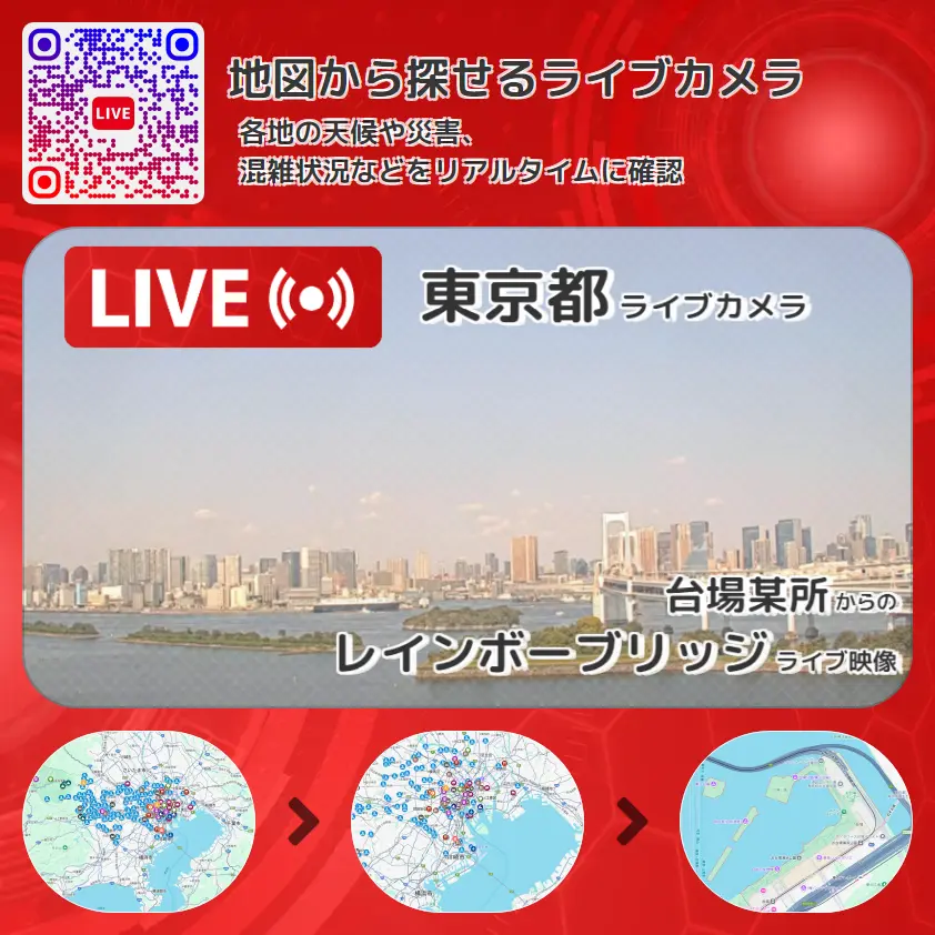レインボーブリッジ(東京港連絡橋)の他に、首都高速道路(首都高速11号台場線)や周辺の気象状況も併せてチェックすることが可能で、台風・大雨・地震などの災害による被害状況も把握することができます。