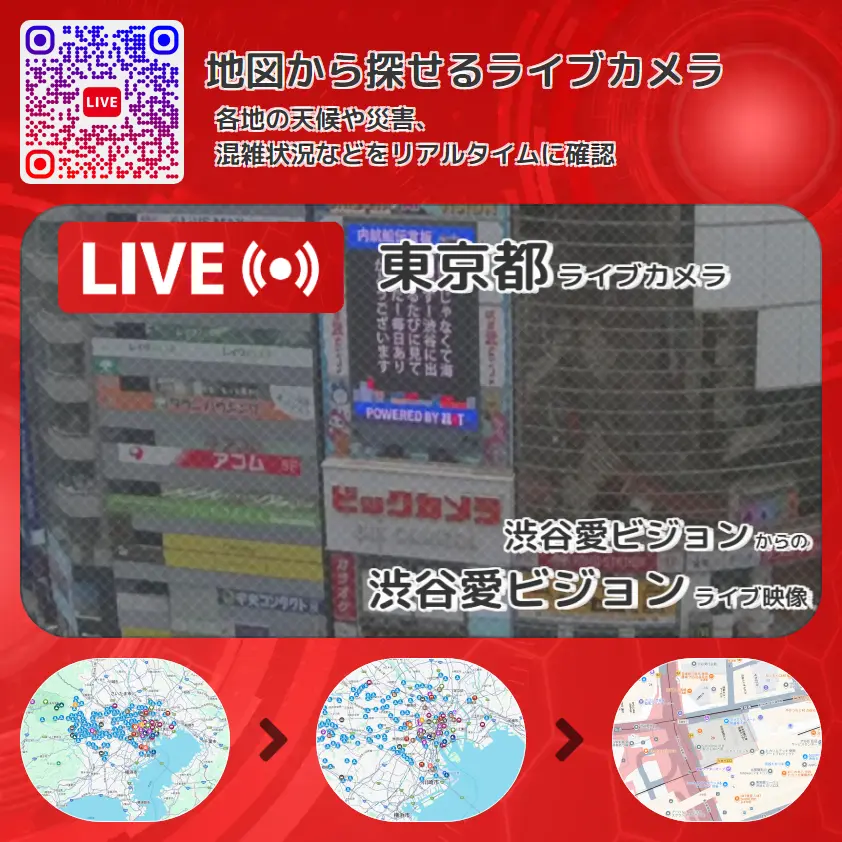 渋谷愛ビジョン(大型ビジョン)の他に、宮益坂下交差点(宮益坂交差点)や周辺の気象状況も併せてチェックすることが可能で、台風・大雨・地震などの災害による被害状況も把握することができます。