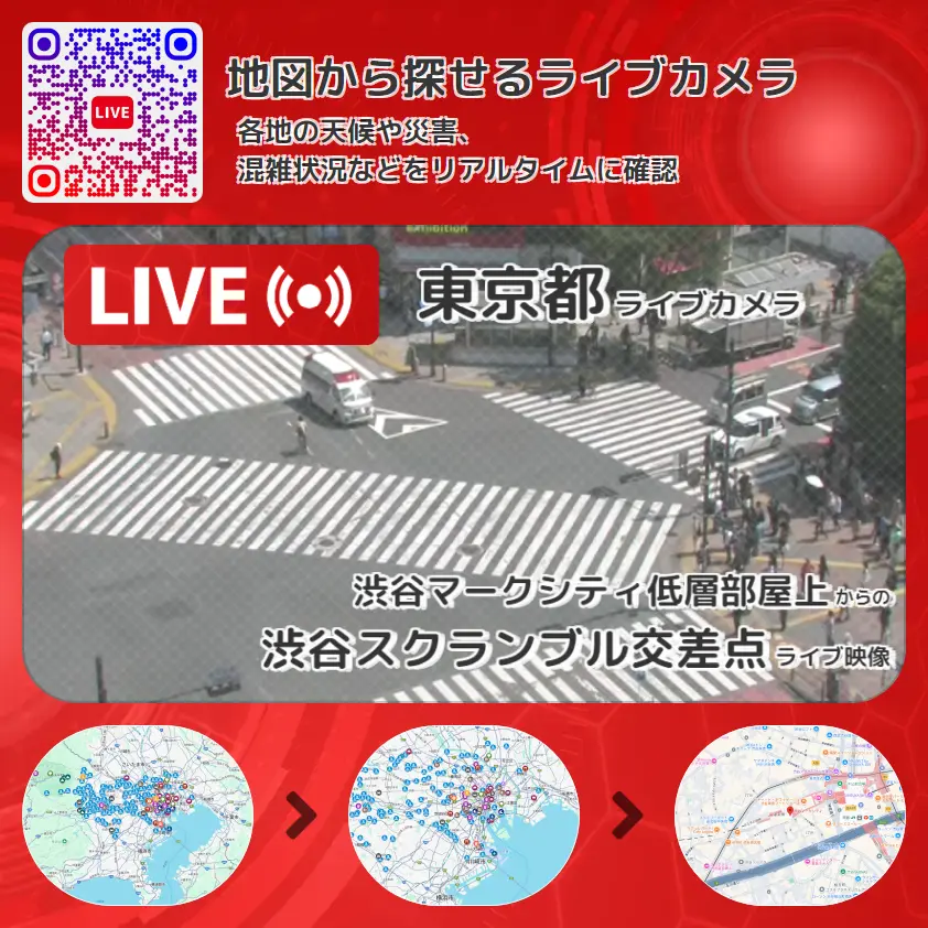 渋谷スクランブル交差点(渋谷駅前交差点)の他に、渋谷駅前や周辺の気象状況も併せてチェックすることが可能で、台風・大雨・地震などの災害による被害状況も把握することができます。