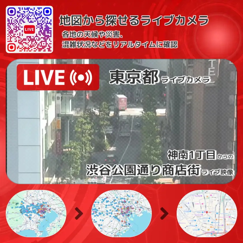 渋谷公園通り商店街の他に、渋谷東武ホテルや周辺の気象状況も併せてチェックすることが可能で、台風・大雨・地震などの災害による被害状況も把握することができます。