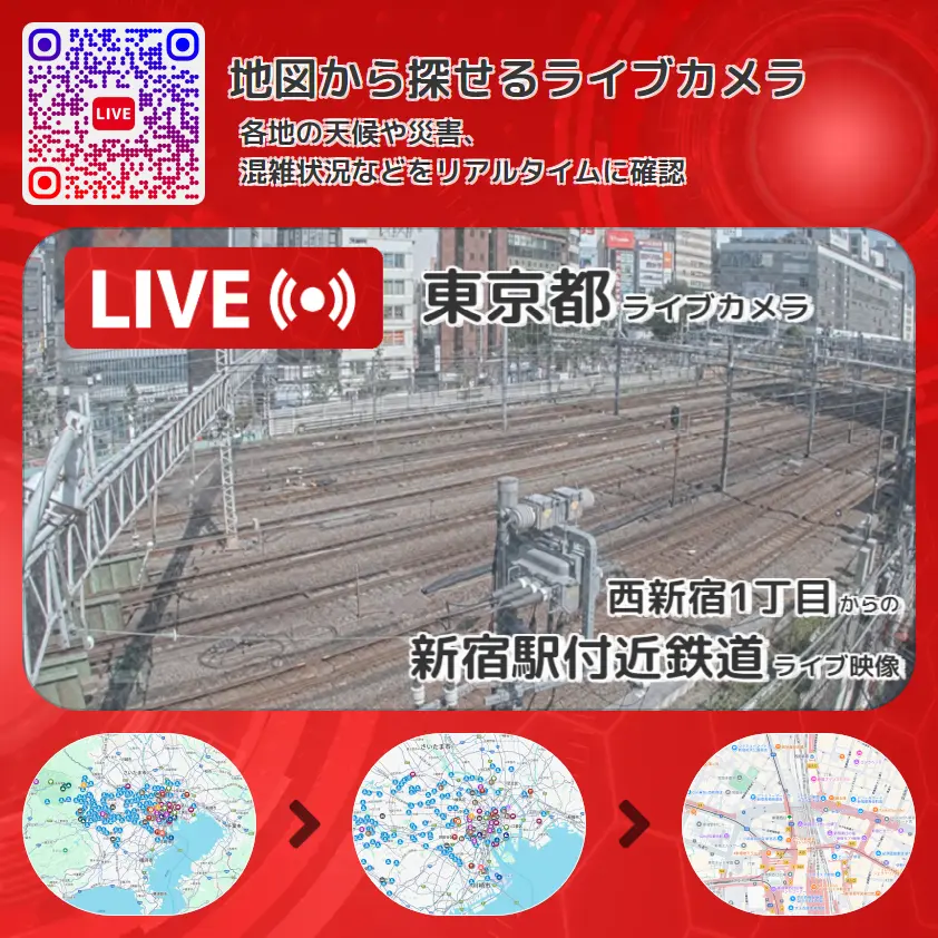 新宿駅付近鉄道(山手線・埼京線・湘南新宿ライン・中央線快速・中央総武線)の他に、靖国通りや周辺の気象状況も併せてチェックすることが可能で、台風・大雨・地震などの災害による被害状況も把握することができます。