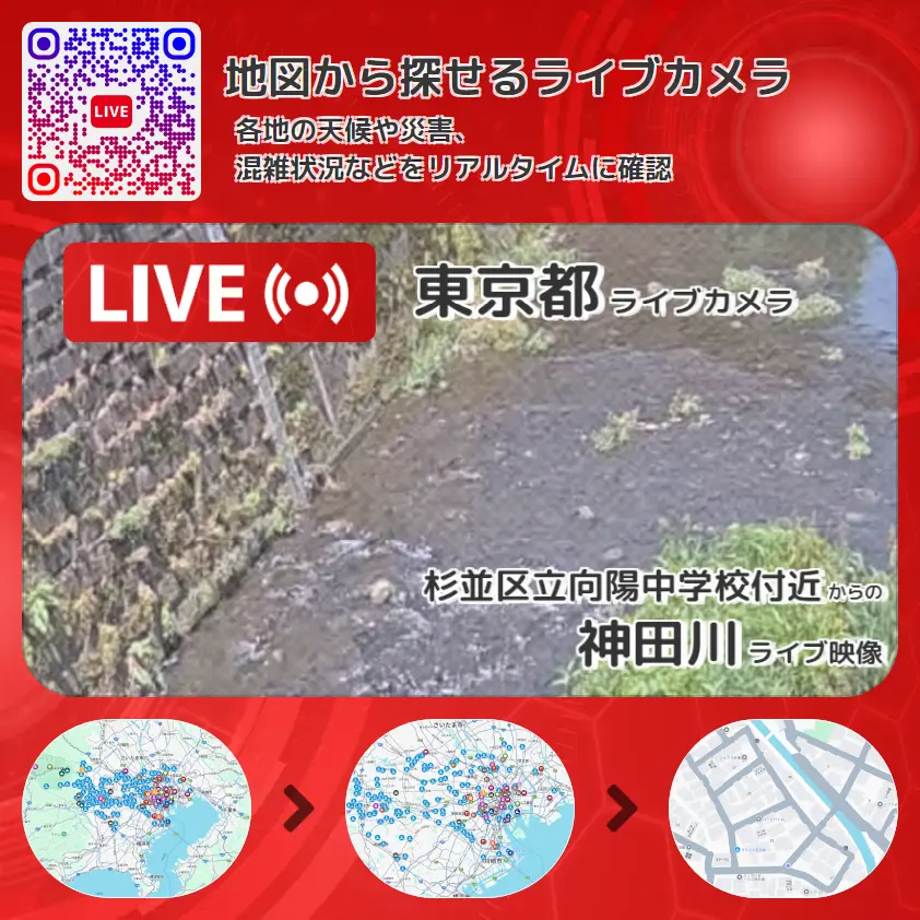 杉並区立向陽中学校付近(向陽橋)から、神田川が確認できるライブカメラです。