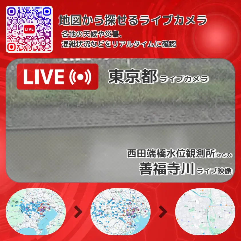 周辺の気象状況も併せてチェックすることが可能で、台風・大雨・地震などの災害による被害状況も把握することができます。