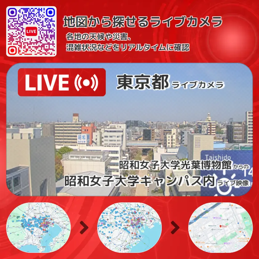 昭和女子大学キャンパス内(人見記念講堂・昭和女子大学図書館)の他に、首都高速道路(首都高速3号渋谷線)や周辺の気象状況も併せてチェックすることが可能で、台風・大雨・地震などの災害による被害状況も把握することができます。