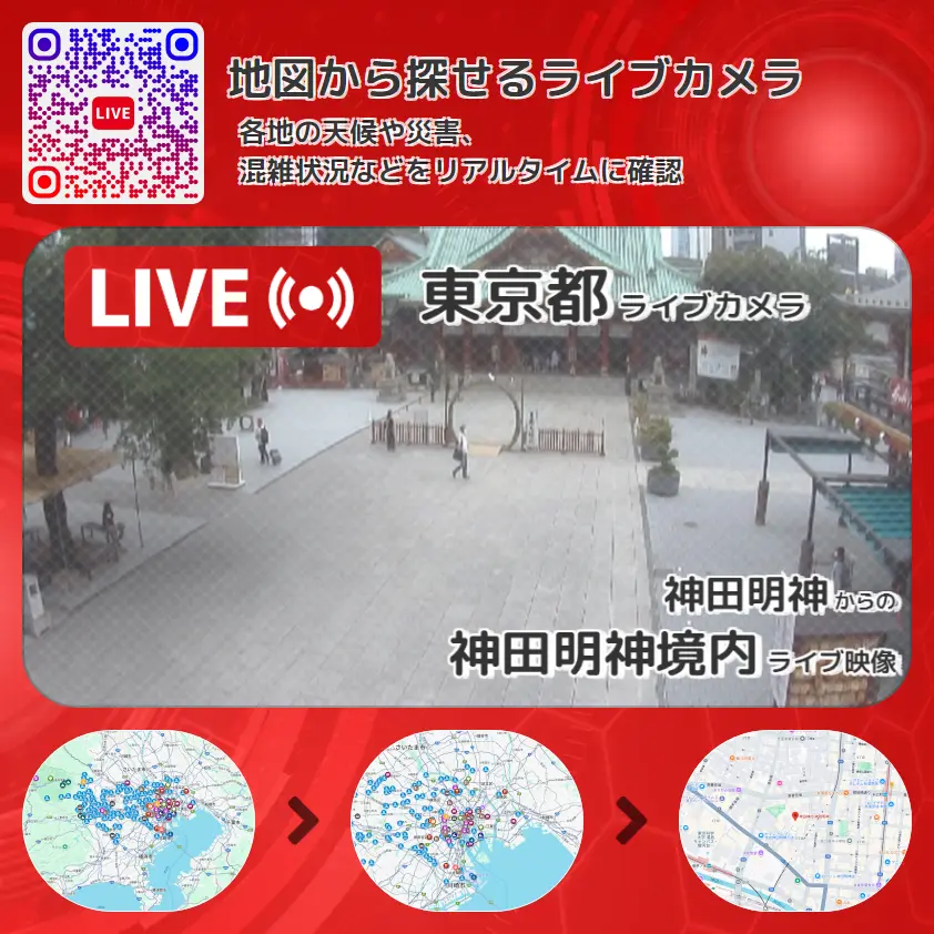 神田明神境内(御神殿・祭祀殿・資料館・文化交流館・祭務所・神楽殿・獅子山・鉄製天水桶・明治天皇御臨幸記念碑・狛犬・小舟町八雲神社・魚河岸水神社)の他に、初詣混雑状況や周辺の気象状況も併せてチェックすることが可能で、台風・大雨・地震などの災害による被害状況も把握することができます。