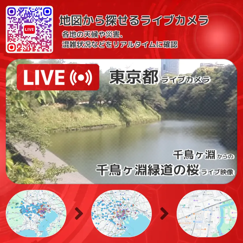 千鳥ヶ淵(千鳥ケ淵・千鳥が淵)から、千鳥ヶ淵緑道の桜(ソメイヨシノやオオシマザクラなど)が確認できるライブカメラです。