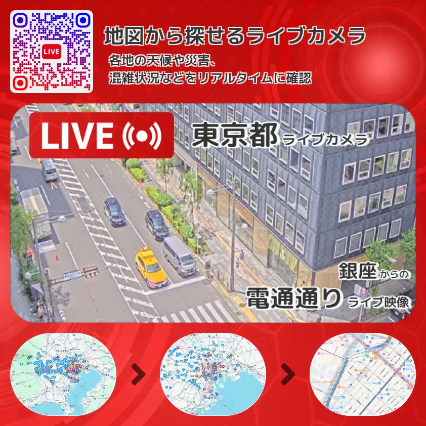 電通通り(外堀通り)の他に、交詢社通りや周辺の気象状況も併せてチェックすることが可能で、台風・大雨・地震などの災害による被害状況も把握することができます。